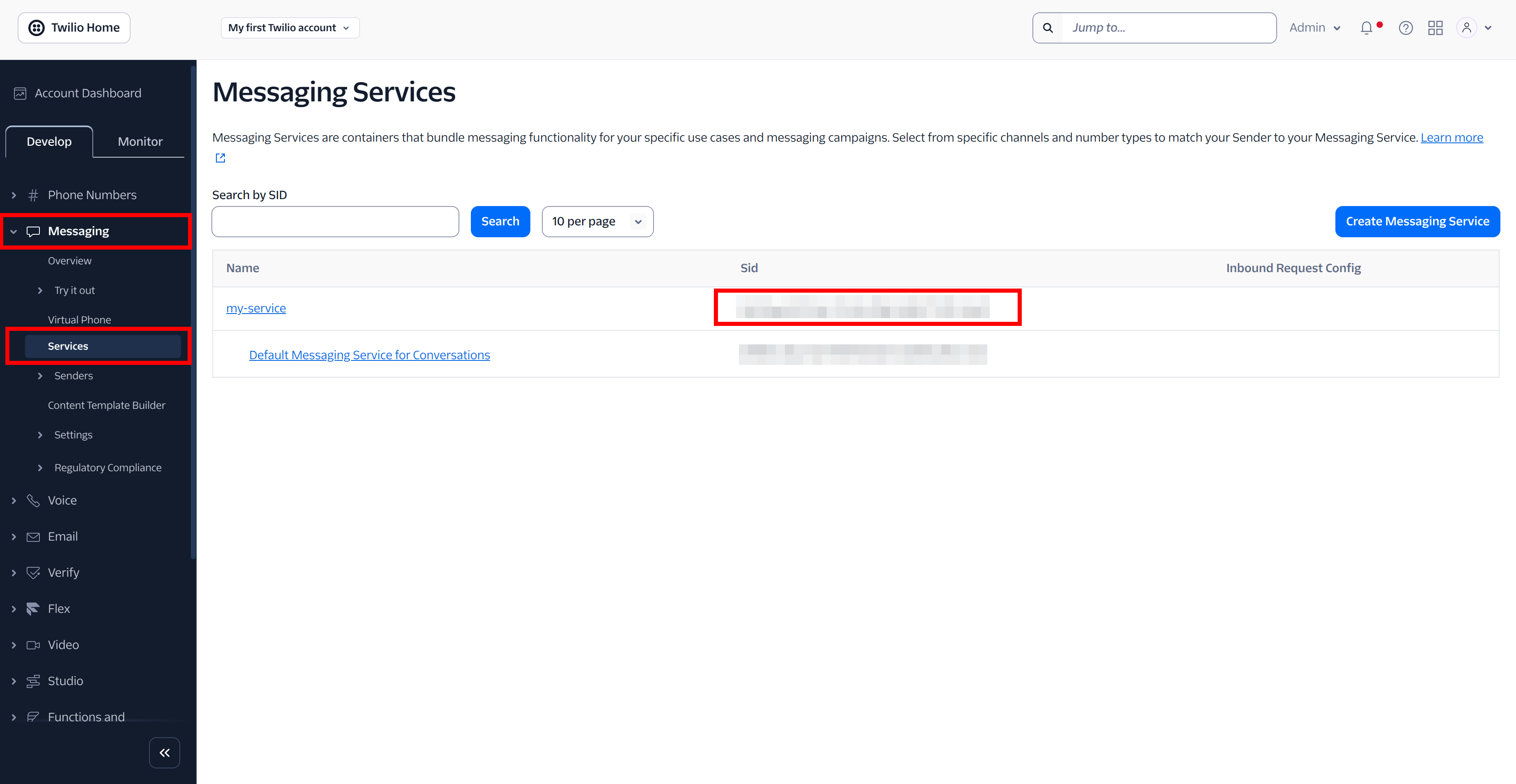 - To retrieve a Messager service SID, open Dashboard -> Messaging -> Services and select the SID for the necessary service