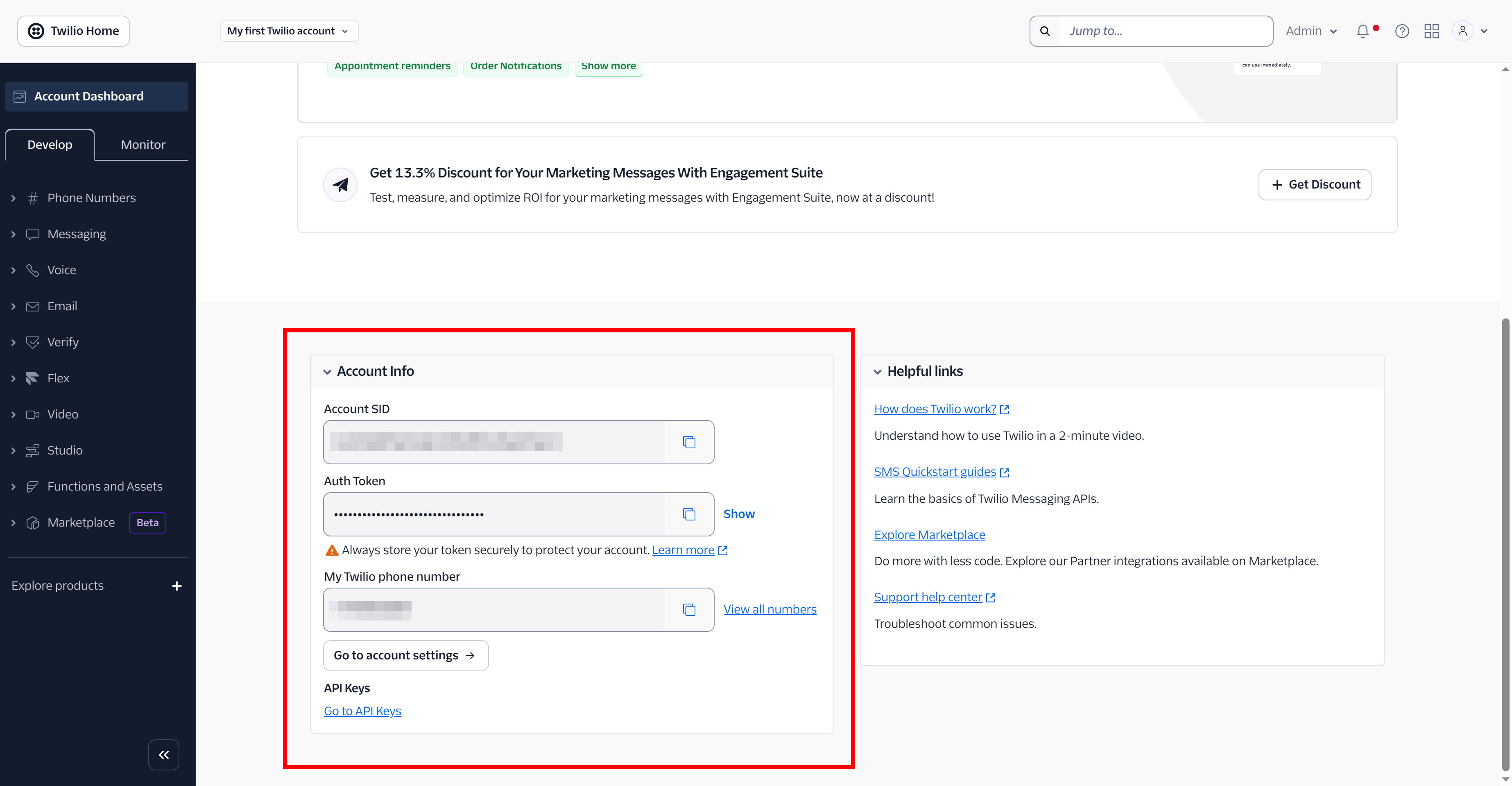 - From the Dashboard, copy the Account SID, Auth token and the Twilio phone number that you will use for the integration.