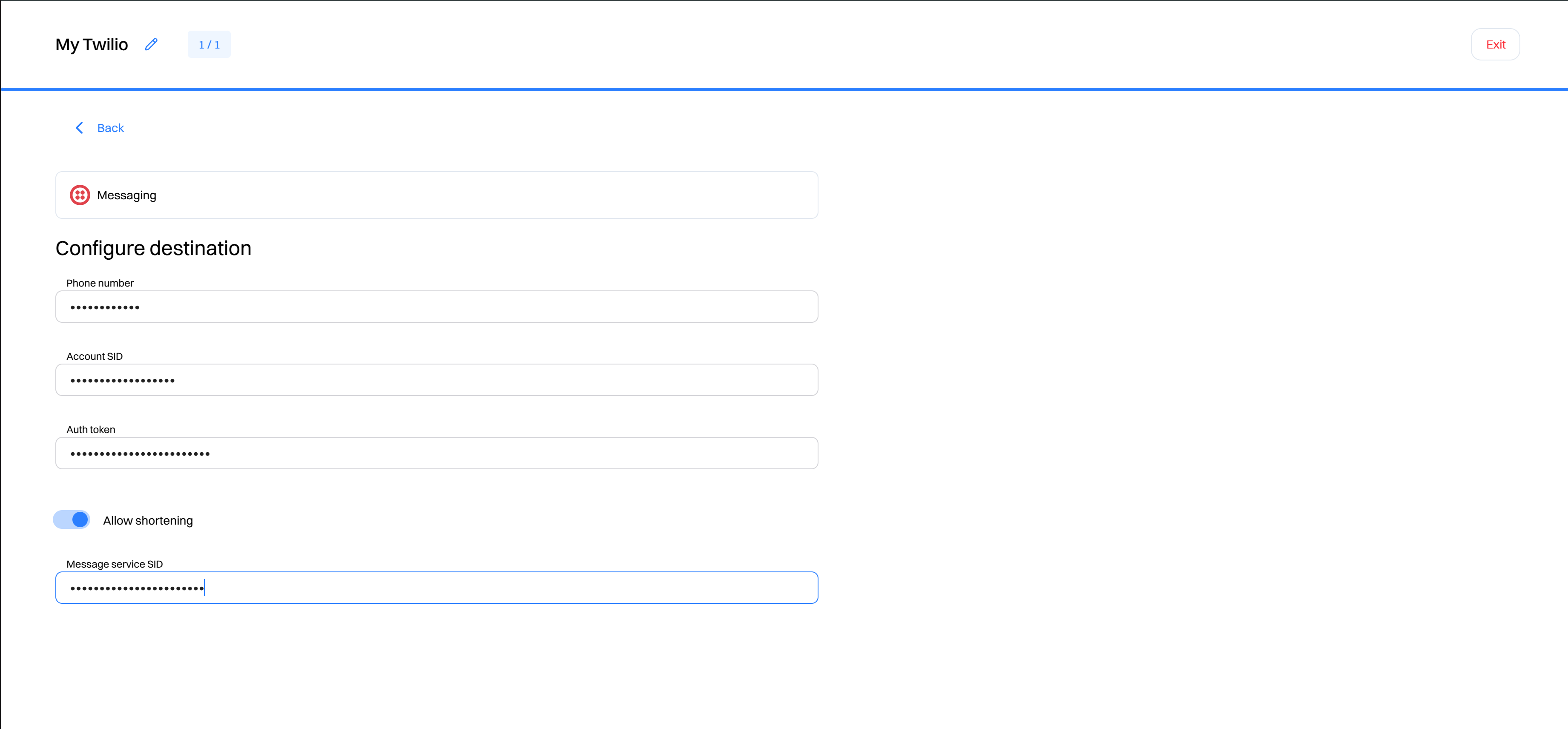 Configure your destination by inputting the following credentials from your Twilio account: